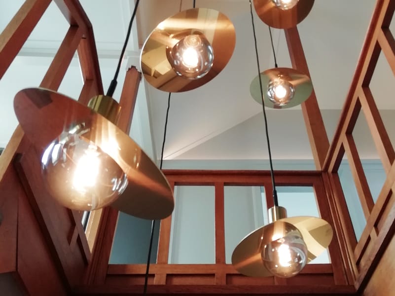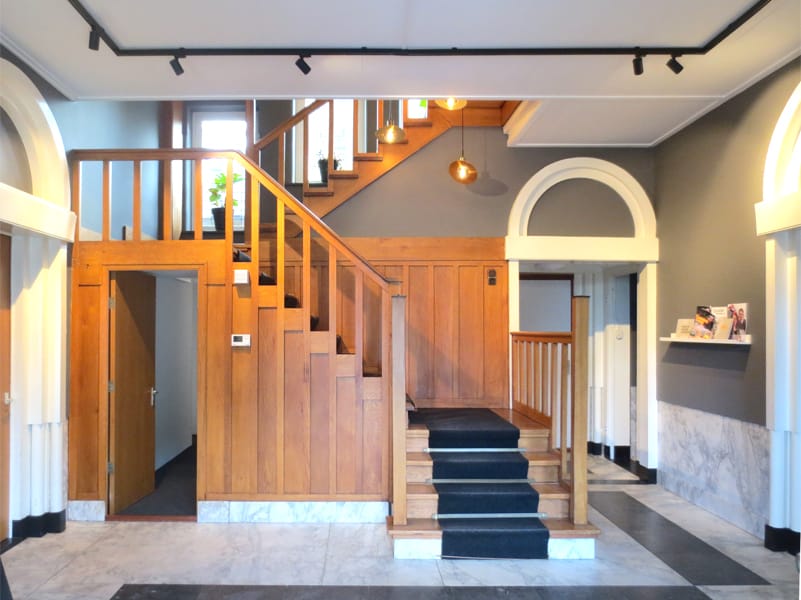 Ik heb allereerst de oude bouwtekeningen opgezocht. De oude routing, nu deels verdwenen, bleek helemaal niet slecht. De mooie hal met houten trap moest er uit springen.  Door de  wanden donker te schilderen komen de witte boogkozijnen, de houten trap en de marmeren vloer veel meer tot hun recht. Lichtrails met kleine spots maakt het mogelijk om eea mooi uit te lichten. Er gebeurt nu echt wat als je binnenkomt. De oude messing fittingen in het trappengat heb op verschillende hoogtes gehangen en voorzien van grote lichtbollen en messing ringen, zodat een soort kroonluchter ontstond. De ‘woonkamer’ werd het ontmoetingspunt. Deze werd oranje, de kleur van het bedrijf, maar bovendien mooi passend bij het oranjeachtige teakhout en de betegelde haardnis. Ook hier weer spots en sfeerverlichting.
