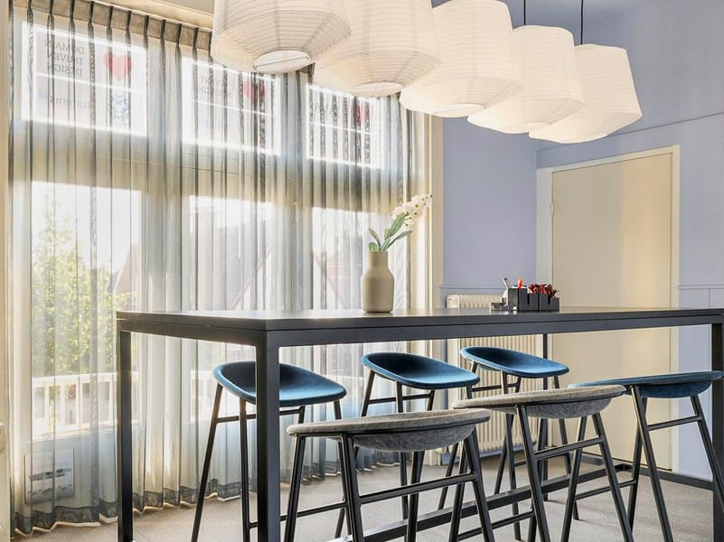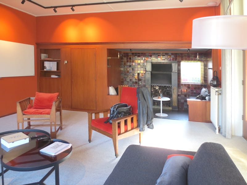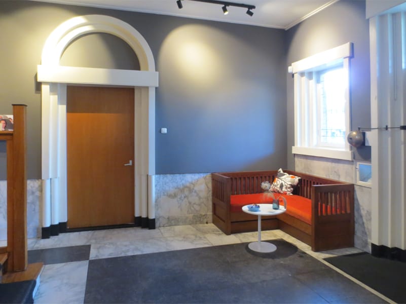 De werk- en vergaderruimtes kregen een meer zakelijke sfeer met lichtblauwe en beige/taupe wanden en deels nieuw, deels tweedehands meubilair, iets waar ik graag gebruik van maak. De bij het pand behorende oude houten meubels werden opnieuw gestoffeerd. De ruimte waar vroeger een keuken was, maar nu kantoor, herstelden we weer in oude glorie door hier de pantry te maken, de ruimte ligt centraal en is  van verschillende kanten toegankelijk.